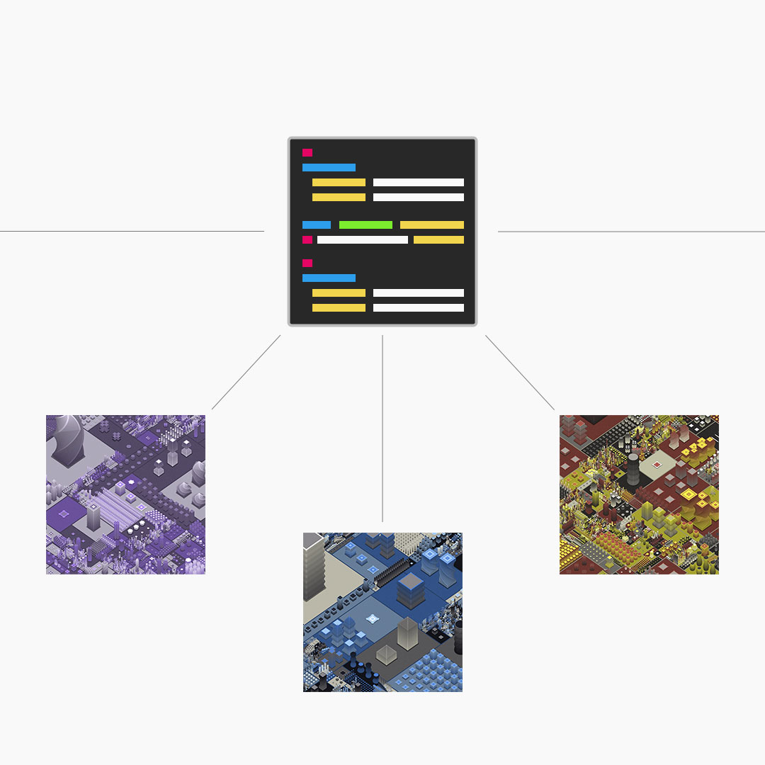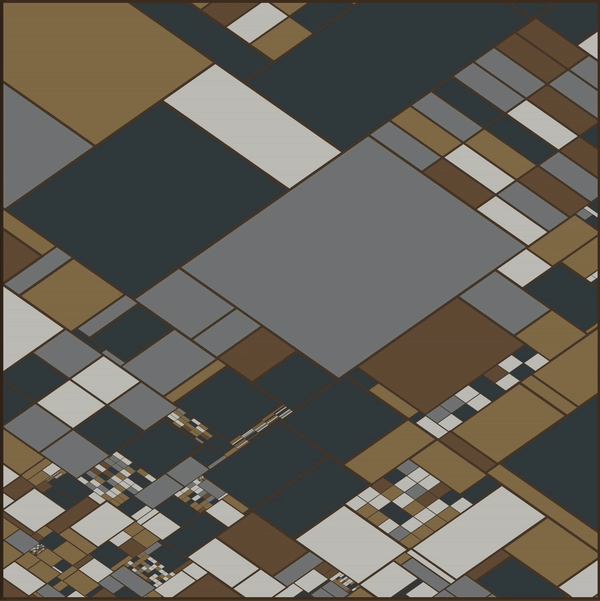 Crafted through intricate JavaScript and P5.js coding, each piece is a technical marvel, with 24 unique packing functions, 39 growth techniques, and 4 grid generation methods. The technical depth behind each piece mirrors the complexity of recursion itself, where each pattern grows with impeccable precision.